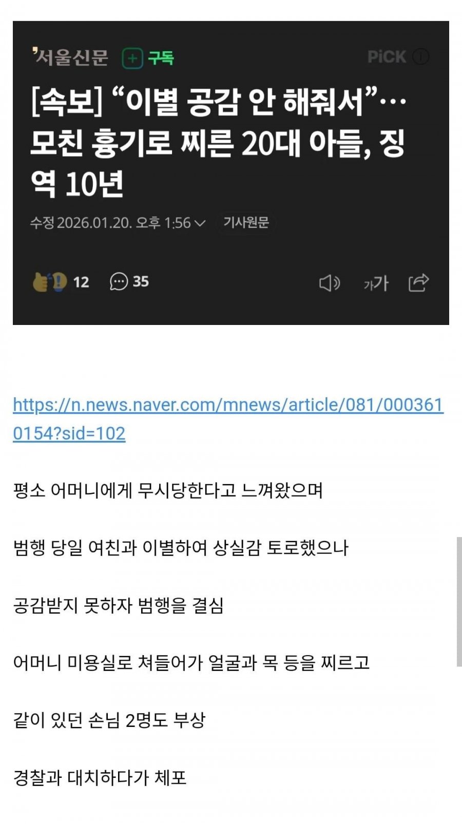"이별 공감 안해줘서.." 모친 흉기로 찌른 20대 아들.. 징역 10년