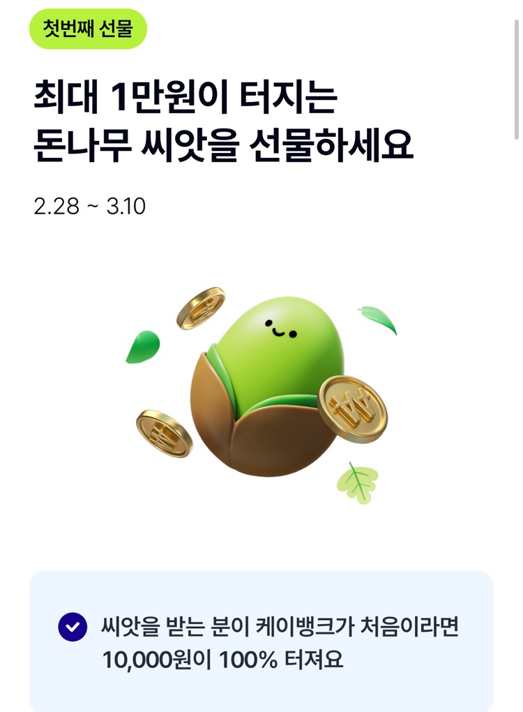 아래 링크로 케이뱅크 돈나무 키우기 시작하면 돈나무 영양제 1개와 5000원을 받아요.